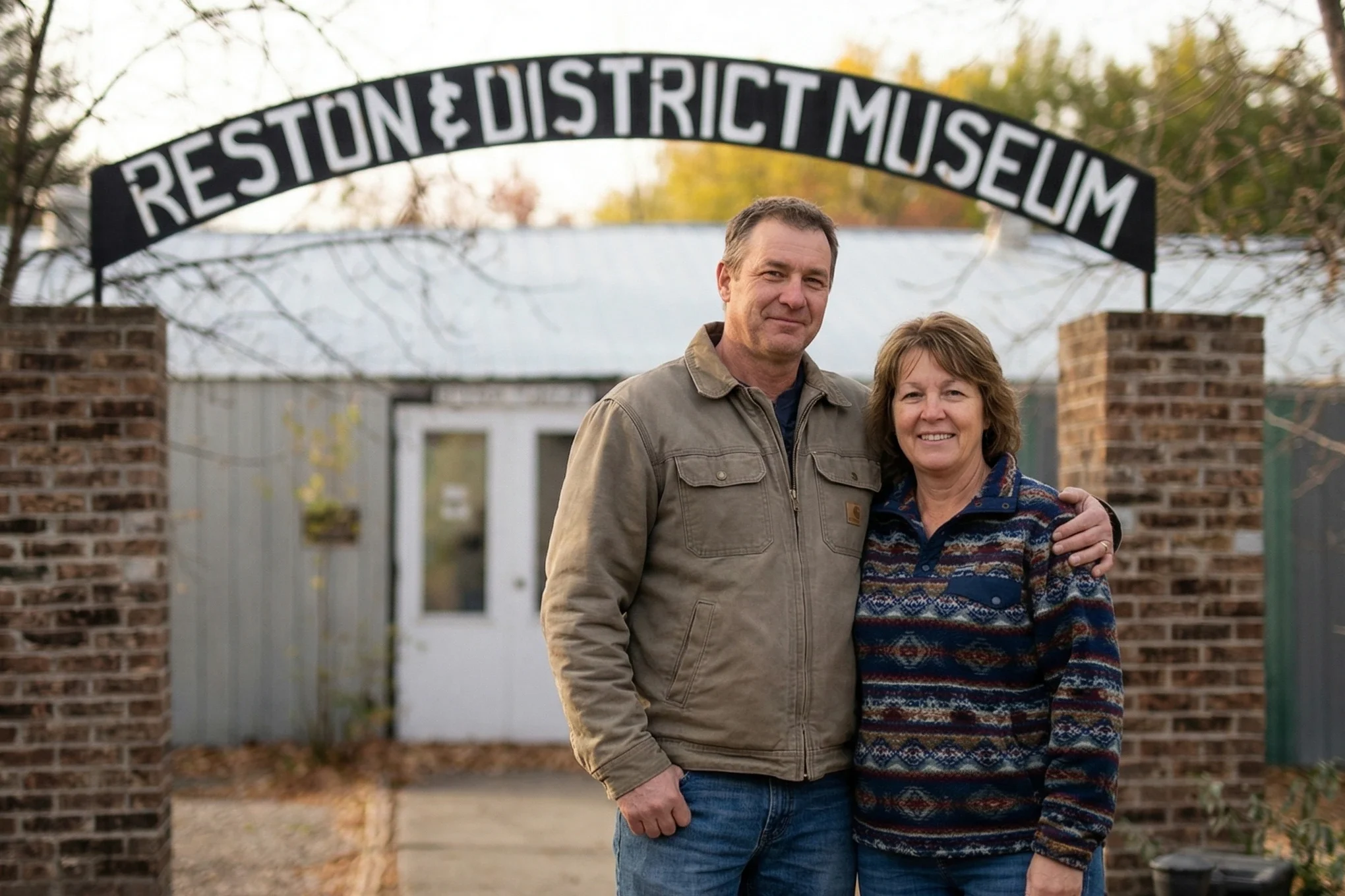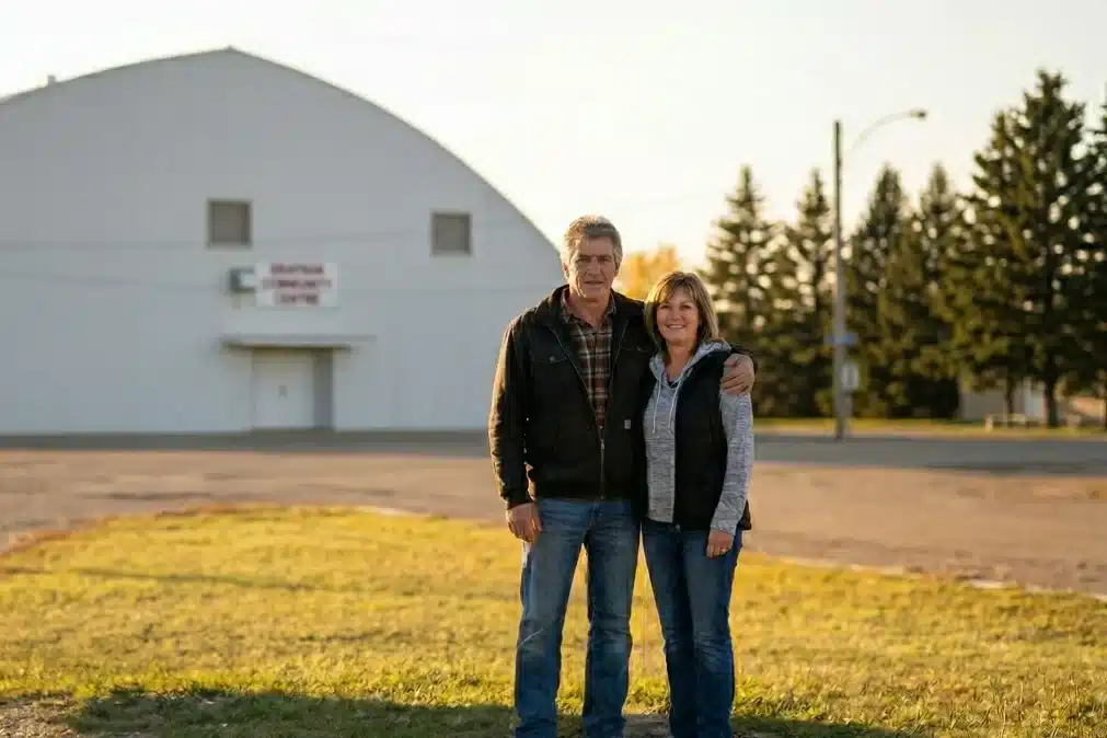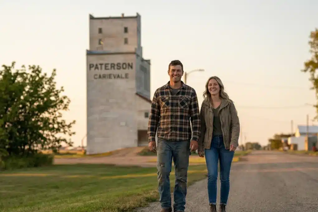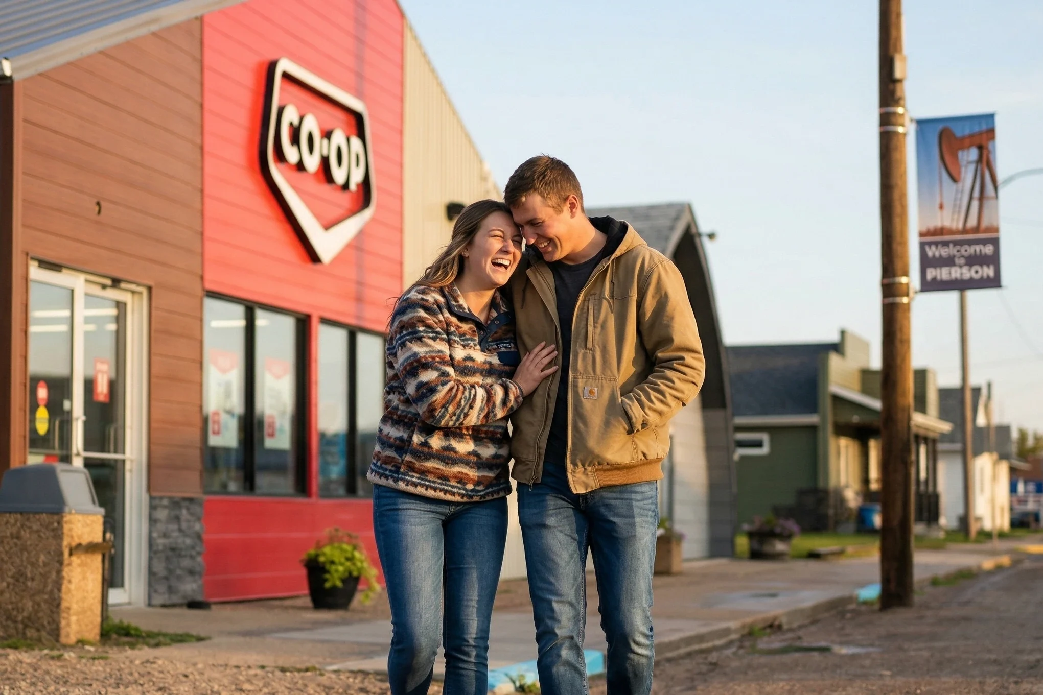 A young couple smiling and walking together outdoors in Virden, Manitoba, with a small-town streetscape and tall antenna towers visible in the background.