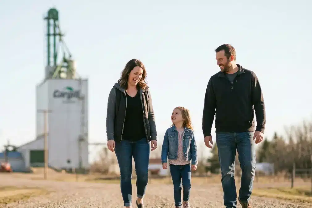 A young family — a mother, father, and toddler — laughing together outdoors near a river with a bridge in the background in Melita, Manitoba.
