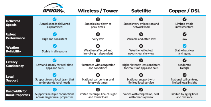 Cable and DSL connections struggle because they rely on older copper-based infrastructure and satellite and fixed wireless connections struggle with weather. Fiber, on the other hand, uses light signals over glass strands, delivering unmatched speed and reliability.